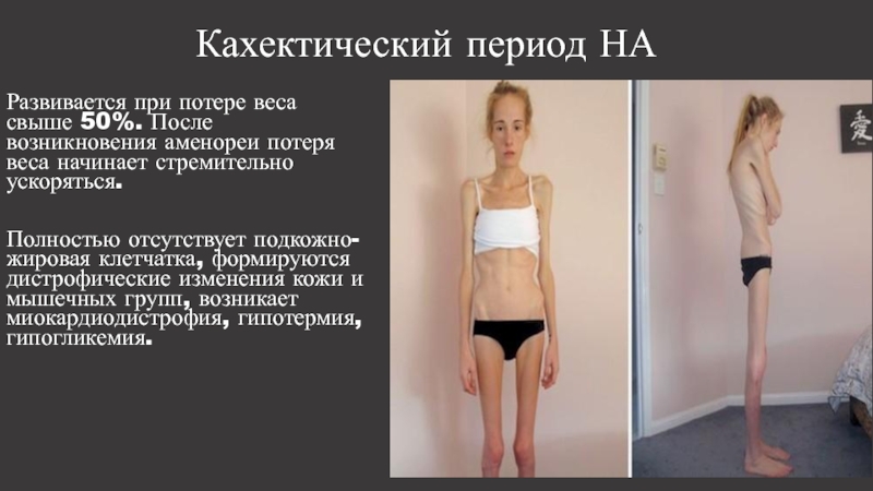 при потере 20–50% от первоначального веса, возникновением соматоэндокринных нарушений, олигоаменореи