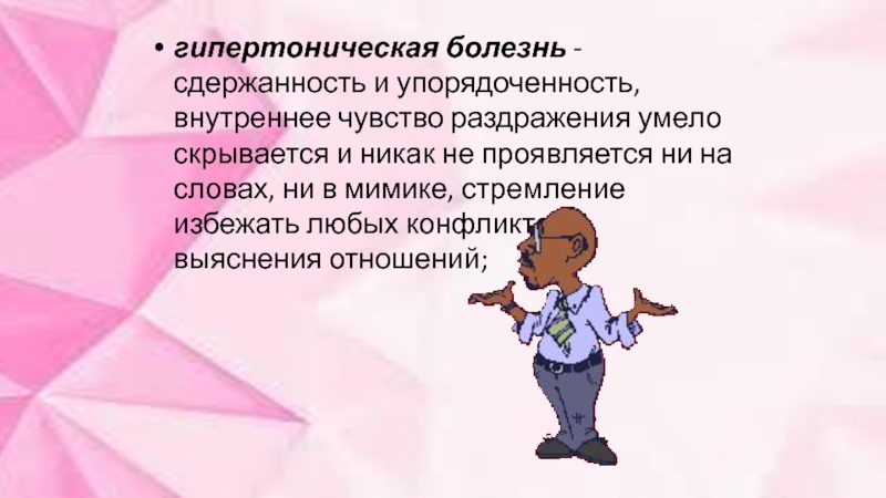 Слайд 86гипертоническая болезнь - сдержанность и упорядоченность, внутреннее чувство раздражения умело
