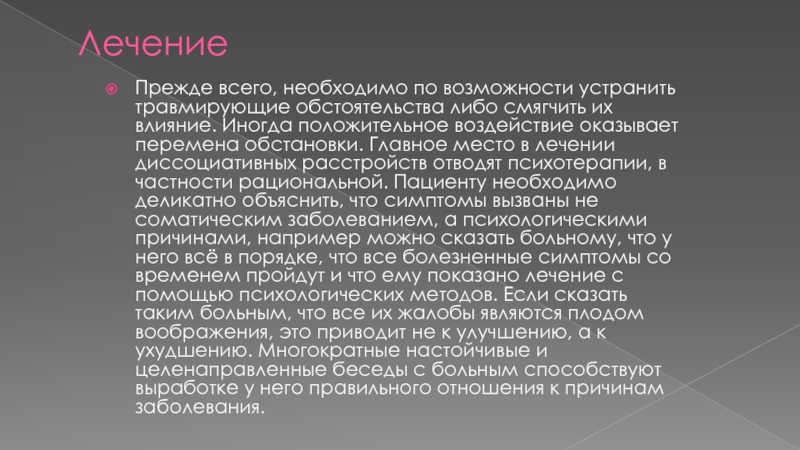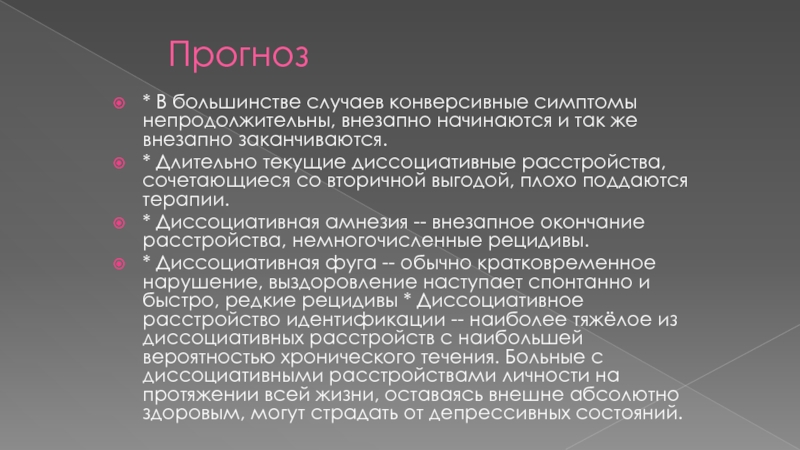 Конверсионные симптомы полностью обратимы и возникают только в определенных конкретных ситуациях, значимых для человека. Они прекращаются при выходе из трудной ситуации, но могут повторяться при встрече человека с этим же стрессором.
