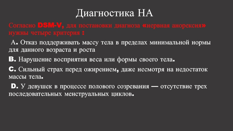 Согласно DSM-V, для постановки диагноза «нервная анорексия» нужны четыре