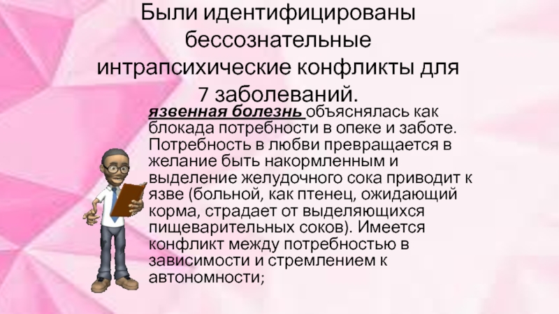 Слайд 80Были идентифицированы бессознательные интрапсихические конфликты для 7 заболеваний.