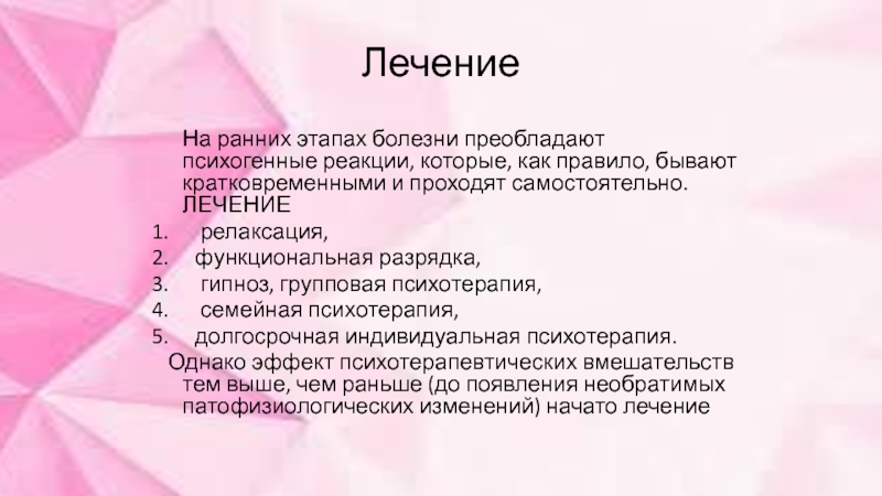 Однако эффект психотерапевтических вмешательств тем выше, чем раньше (до появления необратимых патофизиологических изменений) начато лечение