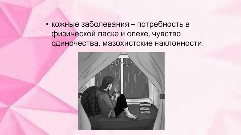 Слайд 89кожные заболевания – потребность в физической ласке и опеке, чувство