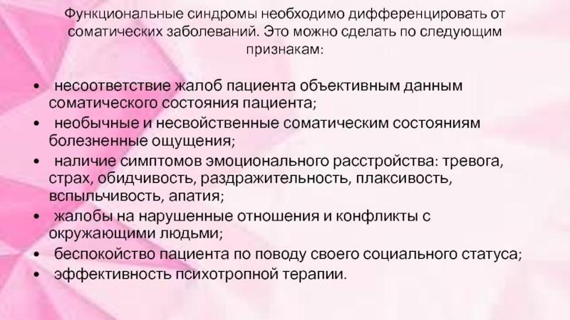 Слайд 94Функциональные синдромы необходимо дифференцировать от соматических заболеваний. Это можно сделать