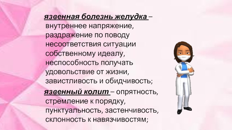 язвенный колит – опрятность, стремление к порядку, пунктуальность, застенчивость, склонность к навязчивостям;