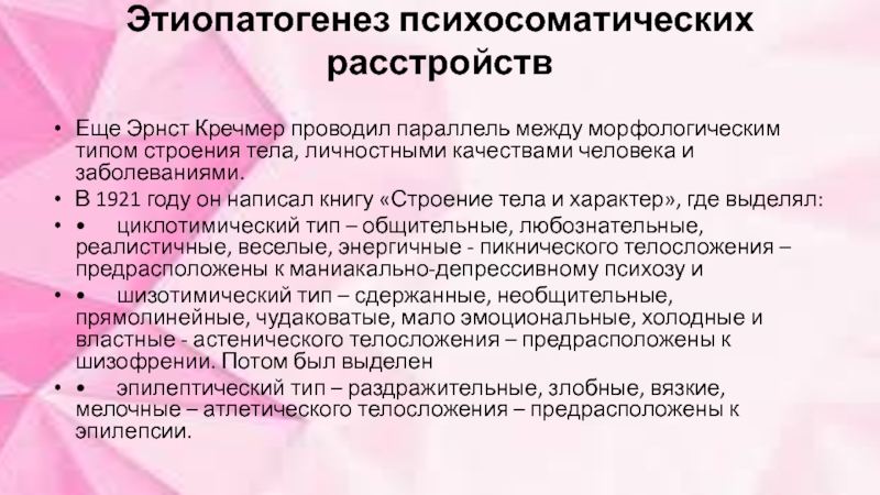 • шизотимический тип – сдержанные, необщительные, прямолинейные, чудаковатые, мало эмоциональные, холодные и властные - астенического телосложения – предрасположены к шизофрении. Потом был выделен
