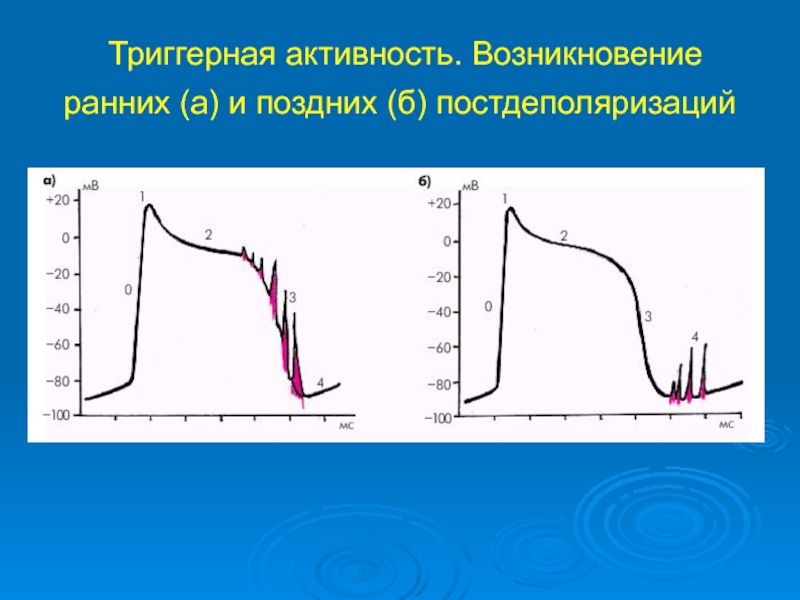Слайд 83Триггерная активность. Возникновение ранних (а) и поздних (б) постдеполяризаций
