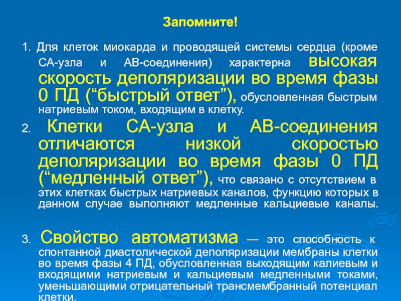 высокая скорость деполяризации во время фазы 0 ПД (“быстрый ответ”),