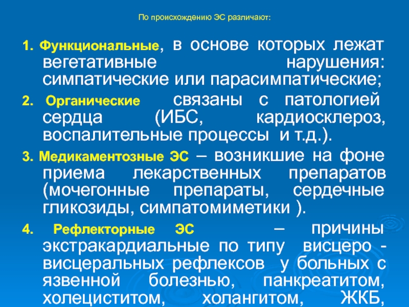 – причины экстракардиальные по типу висцеро - висцеральных рефлексов у больных с язвенной болезнью, панкреатитом, холециститом, холангитом, ЖКБ, гипертиреоз, колиты , энтероколиты.
