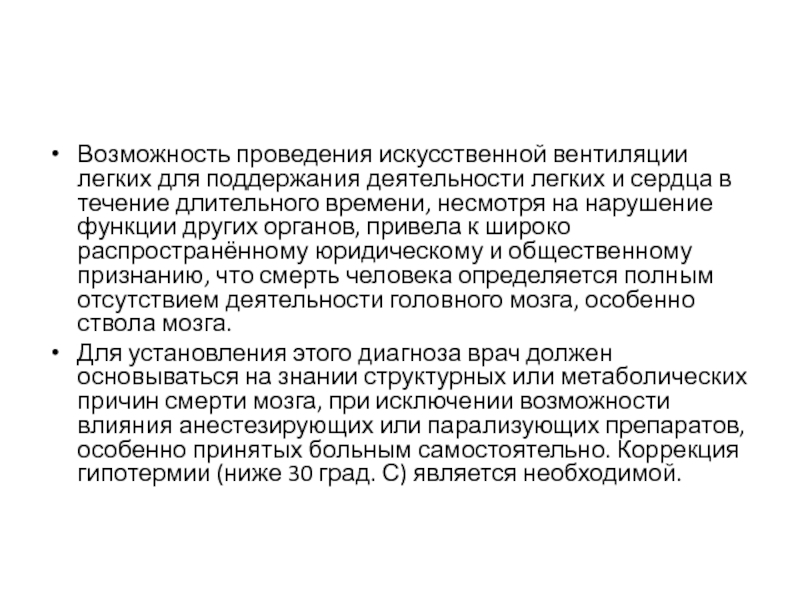 органов, привела к широко распространённому юридическому и общественному признанию, что смерть человека определяется полным отсутствием деятельности головного мозга, особенно ствола мозга.