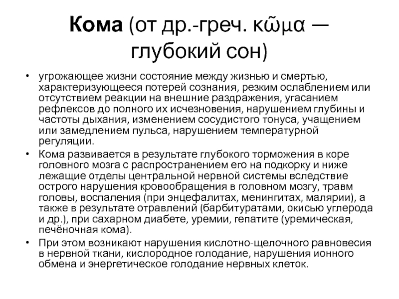 Слайд 16Кома (от др.-греч. κῶμα — глубокий сон)