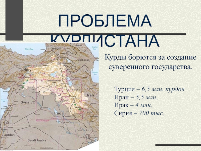 ПРОБЛЕМА КУРДИСТАНАТурция – 6,5 млн. курдовИран – 5,5 млн.Ирак – 4 млн.Сирия – 700 тыс.Курды борются за