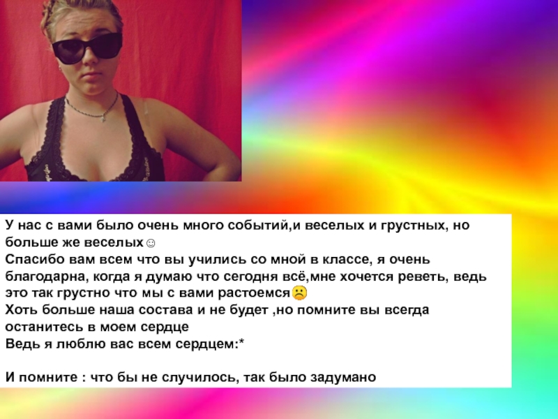 со мной в классе, я очень благодарна, когда я думаю что сегодня всё,мне хочется реветь, ведь это так грустно что мы с вами растоемся