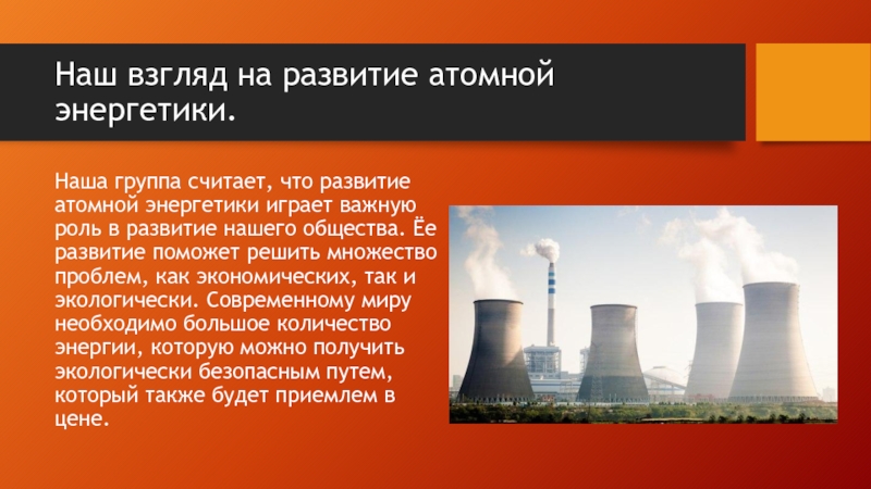 Наш взгляд на развитие атомной энергетики. Наша группа считает, что развитие атомной энергетики играет важную роль в
