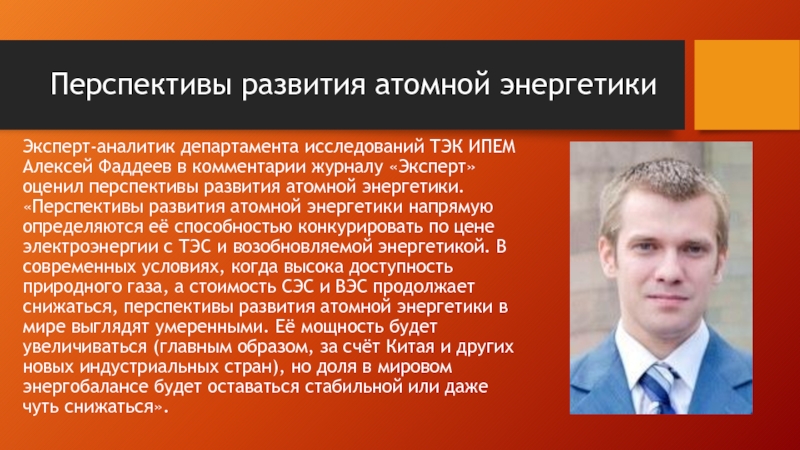 Перспективы развития атомной энергетикиЭксперт-аналитик департамента исследований ТЭК ИПЕМ Алексей Фаддеев в комментарии журналу «Эксперт» оценил перспективы развития