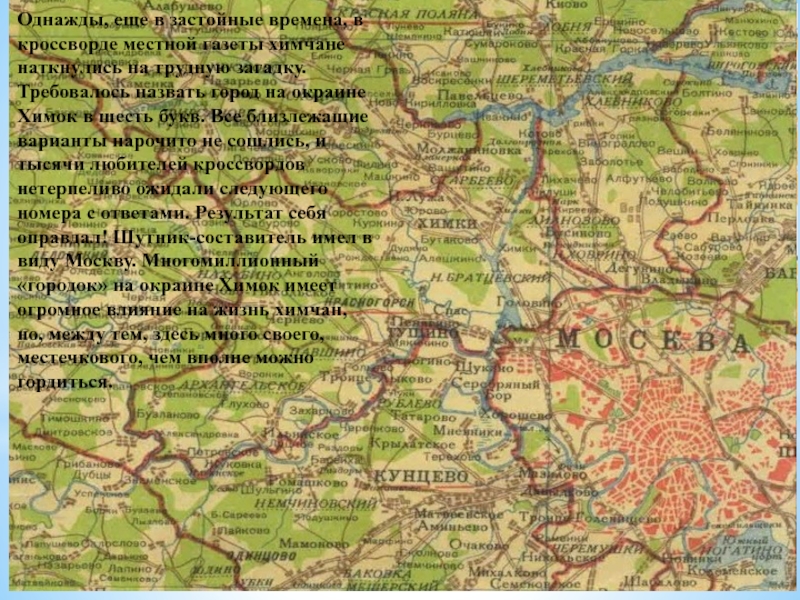 в шесть букв. Все близлежащие варианты нарочито не сошлись, и тысячи любителей кроссвордов нетерпеливо ожидали следующего номера с ответами. Результат себя оправдал! Шутник-составитель имел в виду Москву. Многомиллионный «городок» на окраине Химок имеет огромное влияние на жизнь химчан, но, между тем, здесь много своего, местечкового, чем вполне можно гордиться.