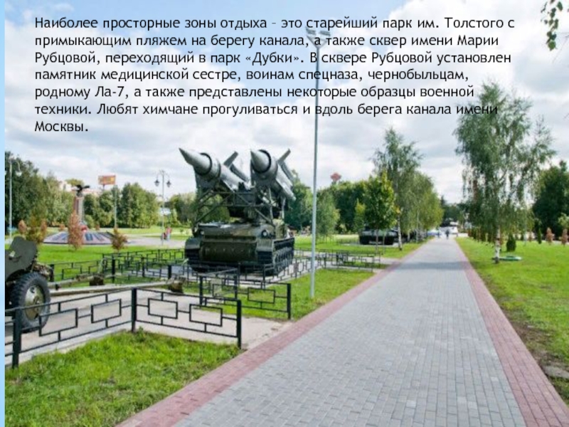 Марии Рубцовой, переходящий в парк «Дубки». В сквере Рубцовой установлен памятник медицинской сестре, воинам спецназа, чернобыльцам, родному Ла-7, а также представлены некоторые образцы военной техники. Любят химчане прогуливаться и вдоль берега канала имени Москвы.
