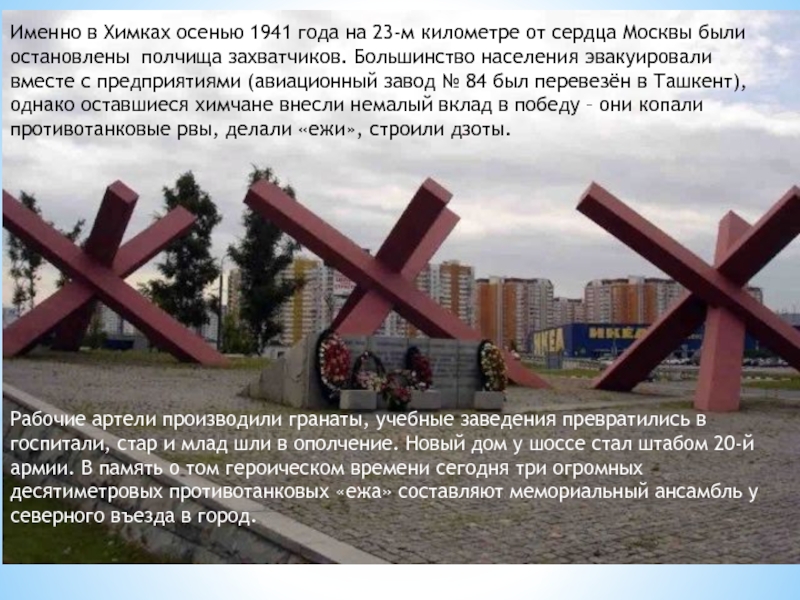 Слайд 7Именно в Химках осенью 1941 года на 23-м километре от
