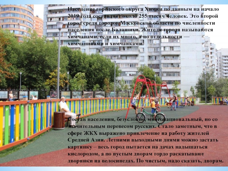 Московской области по численности населения после Балашихи. Жители города называются химчанами, если их много, а по отдельности — химчанинами и химчанками.
