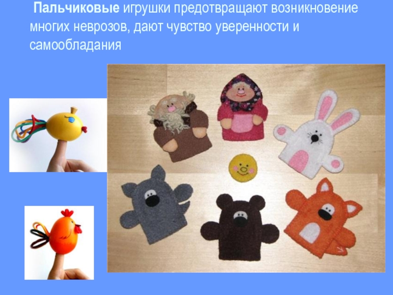 Слайд 64 Пальчиковые игрушки предотвращают возникновение многих неврозов, дают чувство уверенности