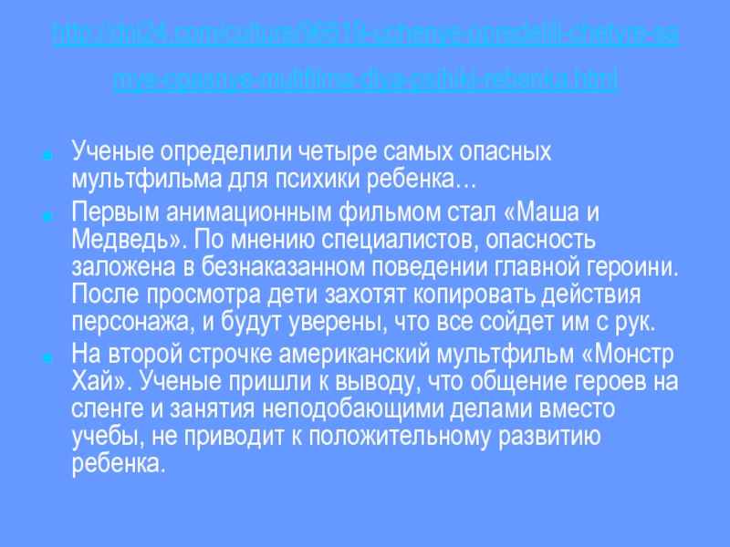 Слайд 74http://dni24.com/culture/96619-uchenye-opredelili-chetyre-samye-opasnye-multfilma-dlya-psihiki-rebenka.html