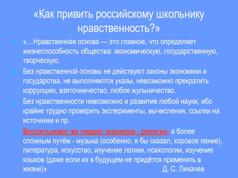 Воспитывают же людей: впрямую - религия, а более сложным путём - музыка (особенно, я бы сказал, хоровое пение), литература, искусство, изучение логики, психологии, изучение языков (даже если их в будущем не придётся применять в жизни)» Д. С. Лихачев