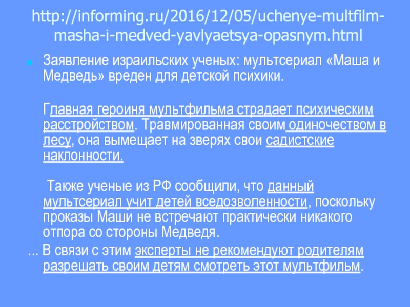 Слайд 54http://informing.ru/2016/12/05/uchenye-multfilm-masha-i-medved-yavlyaetsya-opasnym.html