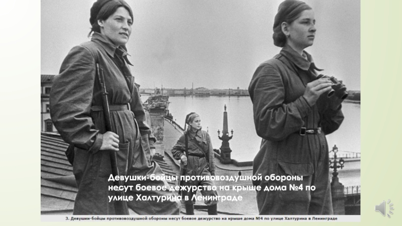 Слайд 7Девушки-бойцы противовоздушной обороны несут боевое дежурство на крыше дома №4