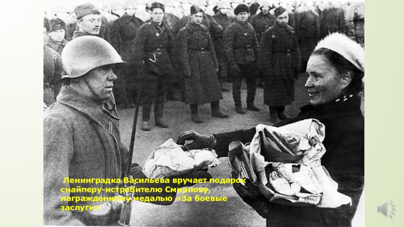 Слайд 10 Ленинградка Васильева вручает подарок снайперу-истребителю Смирнову, награжденному медалью «За боевые