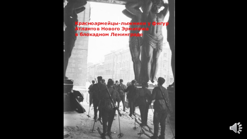 Слайд 9Красноармейцы-лыжники у фигур Атлантов Нового Эрмитажа