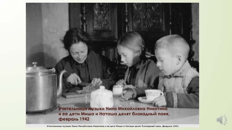 Учительница музыки Нина Михайловна Никитина и ее дети Миша и Наташа делят блокадный паек, февраль 1942