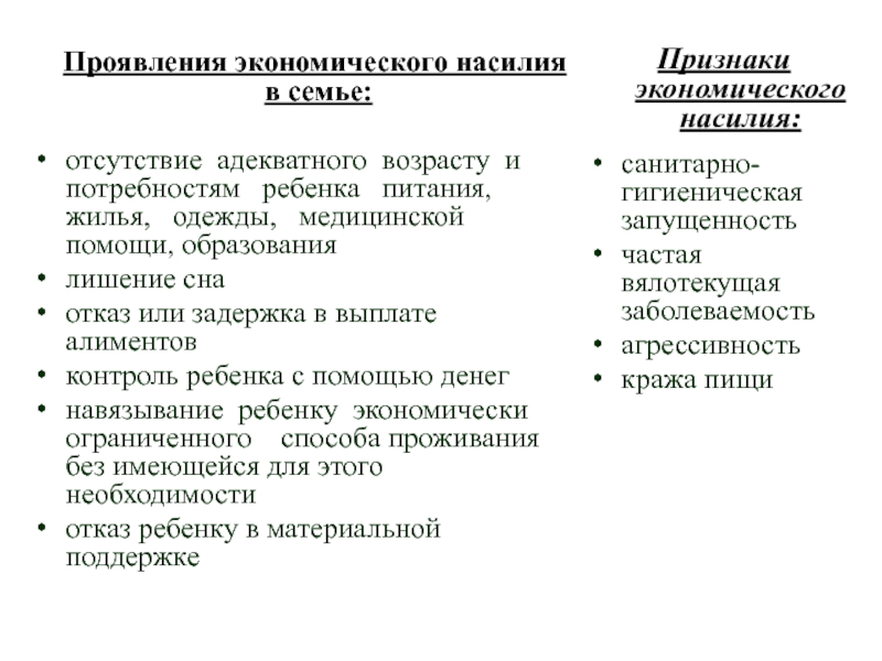 Признаки экономического насилия: