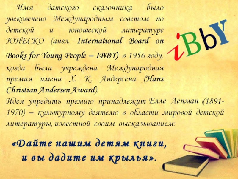 Идея учредить премию принадлежит Елле Лепман (1891-1970) – культурному деятелю в области мировой детской литературы, известной своим высказыванием: