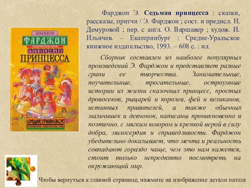 Фарджон Э. Седьмая принцесса : сказки, рассказы, притчи / Э. Фарджон ; сост. и предисл. Н. Демуровой ; пер. с англ. О. Варшавер ; худож. И. Ильичев. – Екатеринбург : Средне-Уральское книжное издательство, 1993. – 608 с. : ил.