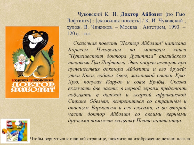 Сказочная повесть "Доктор Айболит" написана Корнеем Чуковским по мотивам книги "Путешествия доктора Дулиттла" английского писателя Гью Лофтинга. Это добрая история про путешествия доктора Айболита и его друзей: утки Кики, собаки Аввы, маленькой свинки Хрю-Хрю, попугая Карудо и совы Бумбы. Сказка включает две части: в первой героям предстоит побывать в далёкой и жаркой африканской Стране Обезьян, встретиться со страшным и опасным Бармалеем и его слугами, а во второй части доктор Айболит со своими верными друзьями поможет мальчику Пенте найти отца.