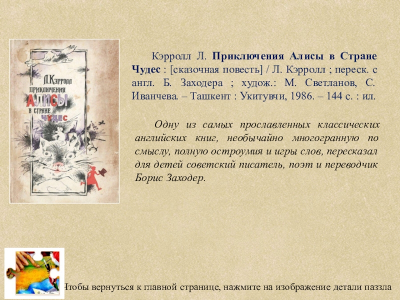 Одну из самых прославленных классических английских книг, необычайно многогранную по смыслу, полную остроумия и игры слов, пересказал для детей советский писатель, поэт и переводчик Борис Заходер.