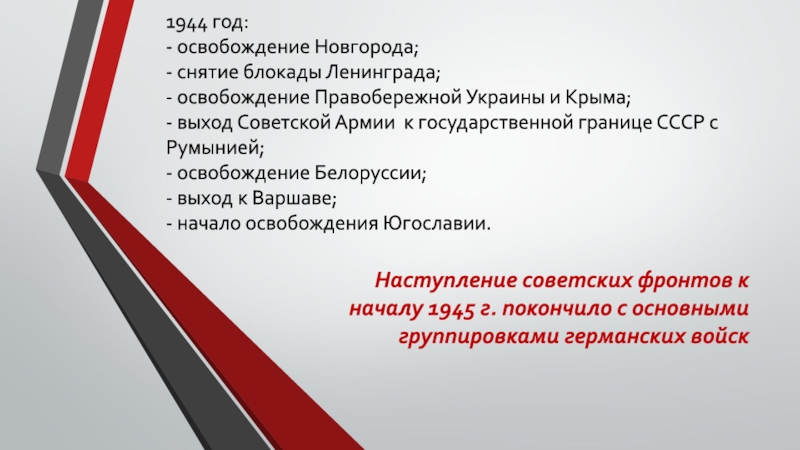 с Румынией; - освобождение Белоруссии; - выход к Варшаве; - начало освобождения Югославии.Наступление советских фронтов к началу 1945 г. покончило с основными группировками германских войск