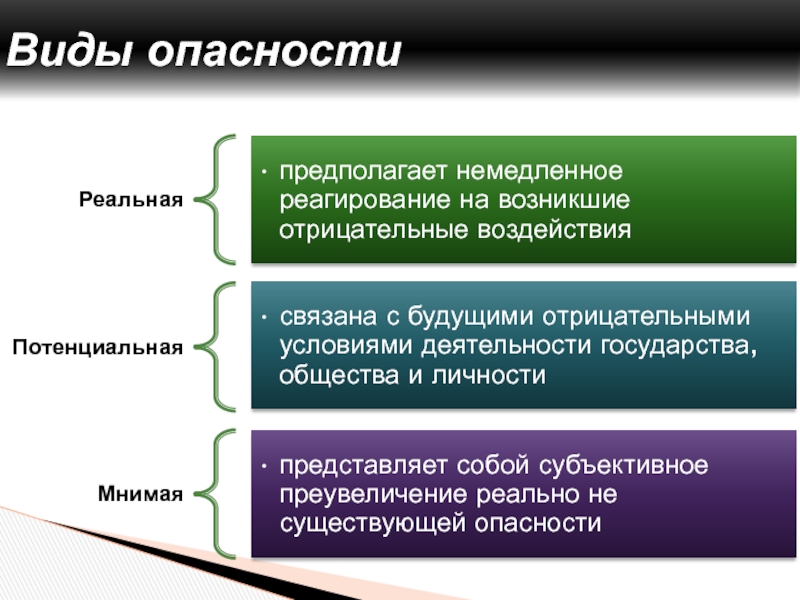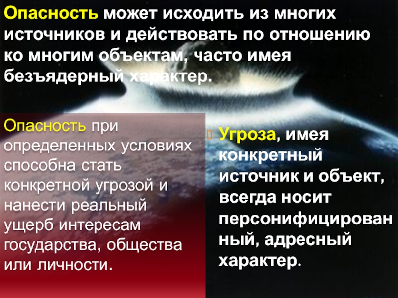 Опасность при определенных условиях способна стать конкретной угрозой и нанести реальный ущерб интересам государства, общества или личности.