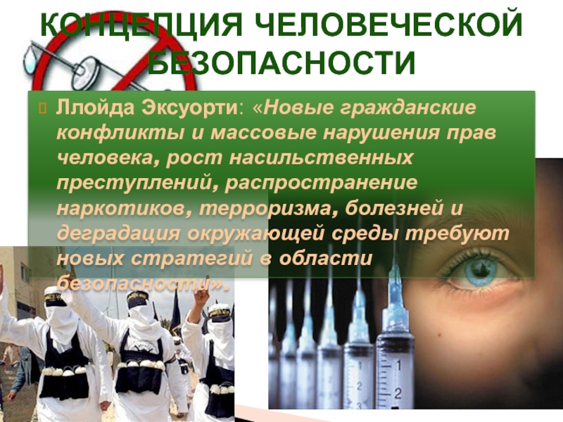 Слайд 71Ллойда Эксуорти: «Новые гражданские конфликты и массовые нарушения прав человека,