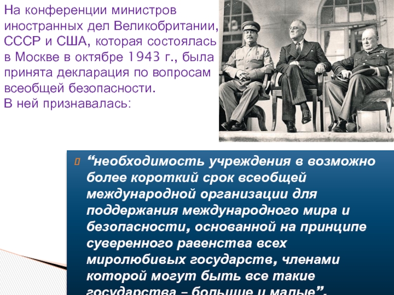 На конференции министров иностранных дел Великобритании, СССР и США, которая состоялась в Москве в октябре 1943 г., была принята декларация по вопросам всеобщей безопасности.