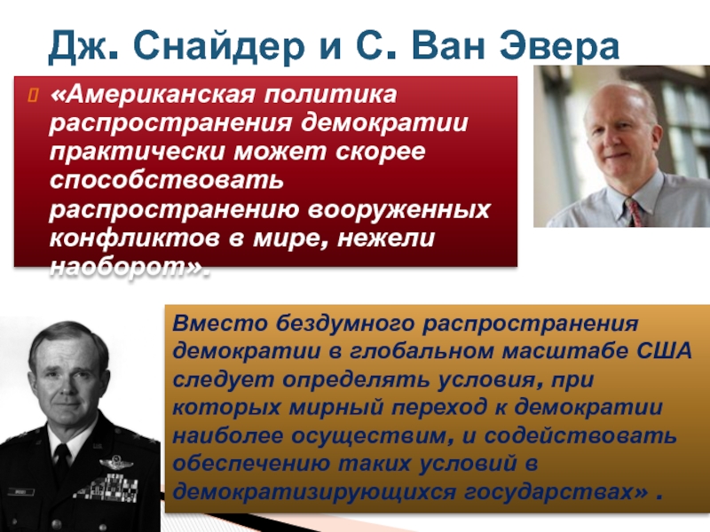 Вместо бездумного распространения демократии в глобальном масштабе США следует определять условия, при которых мирный переход к демократии наиболее осуществим, и содействовать обеспечению таких условий в демократизирующихся государствах» .