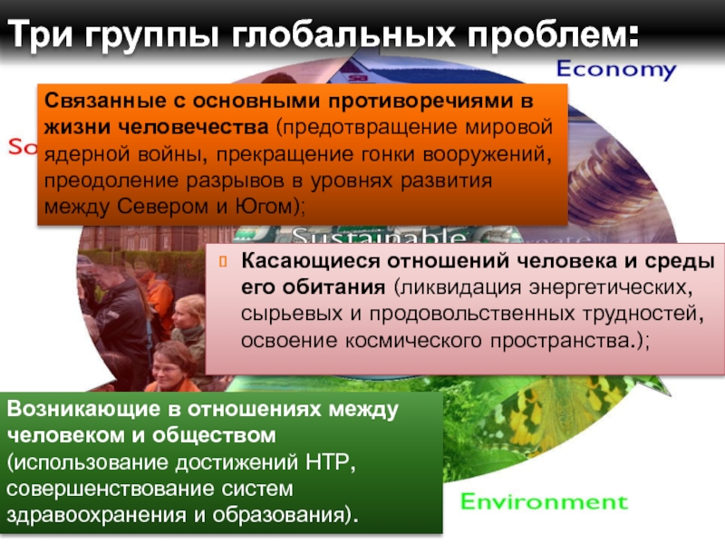 Связанные с основными противоречиями в жизни человечества (предотвращение мировой ядерной войны, прекращение гонки вооружений, преодоление разрывов в уровнях развития между Севером и Югом);