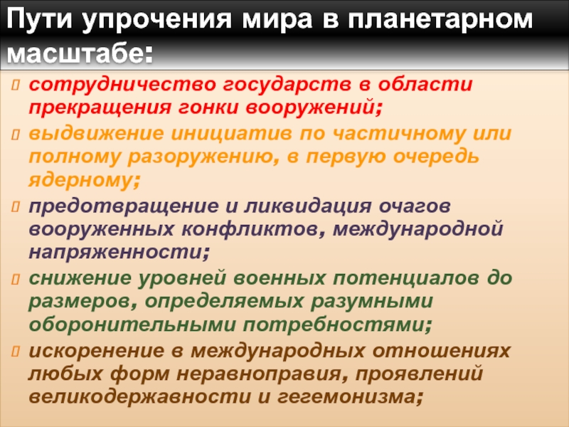 исключении войны из жизни человечества, достижении безъядерного мира;