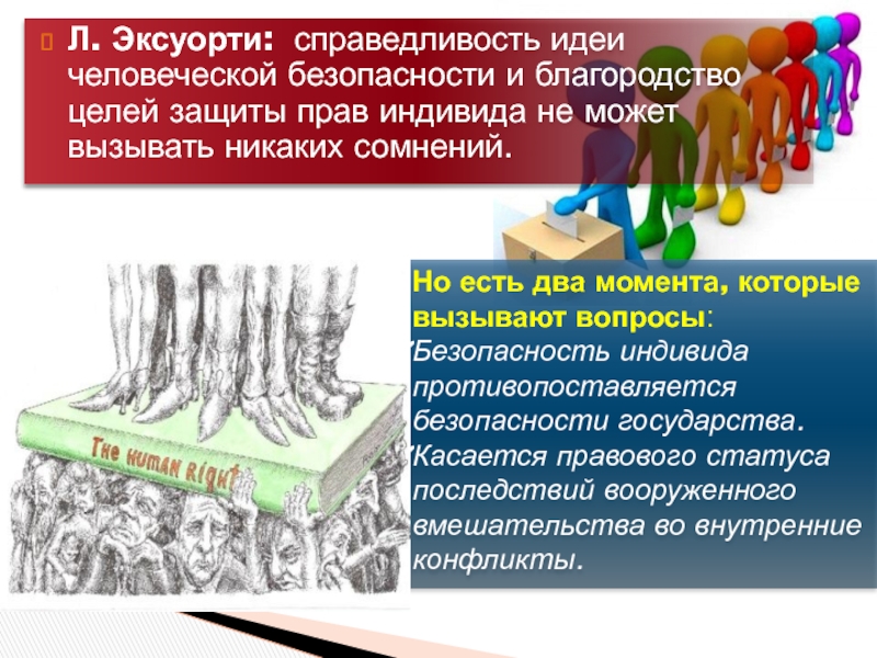 Слайд 72Л. Эксуорти: справедливость идеи человеческой безопасности и благородство целей защиты