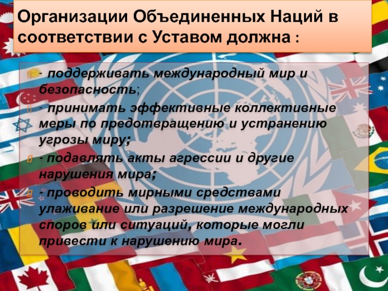 - проводить мирными средствами улаживание или разрешение международных споров или ситуаций, которые могли привести к нарушению мира.