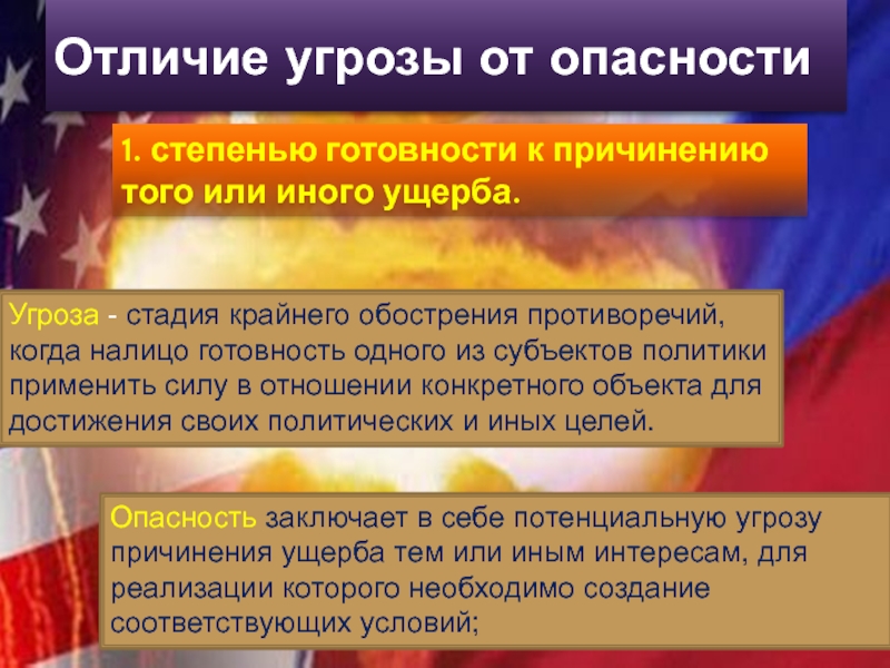 Угроза заключает в себе намерения и возможность нанесения ущерба интересам безопасности.