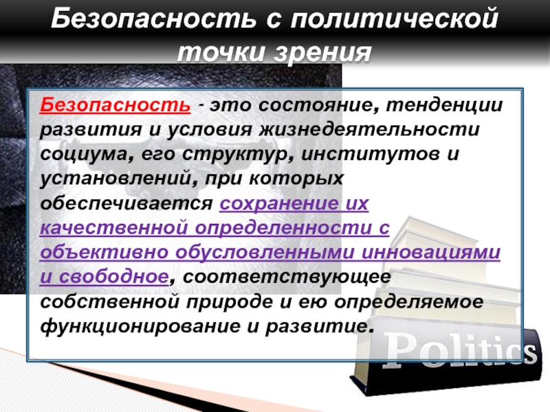 Слайд 4Безопасность - это состояние, тенденции развития и условия жизнедеятельности социума,