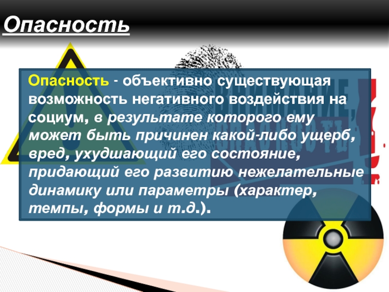 Слайд 8Опасность - объективно существующая возможность негативного воздействия на социум, в