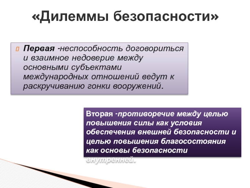 Слайд 64Первая -неспособность договориться и взаимное недоверие между основными субъектами международных