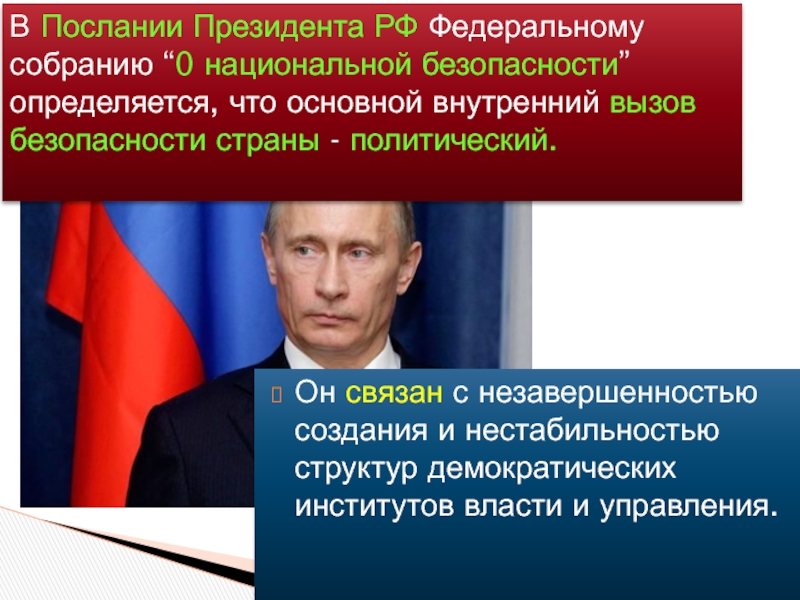 безопасности” определяется, что основной внутренний вызов безопасности страны - политический.